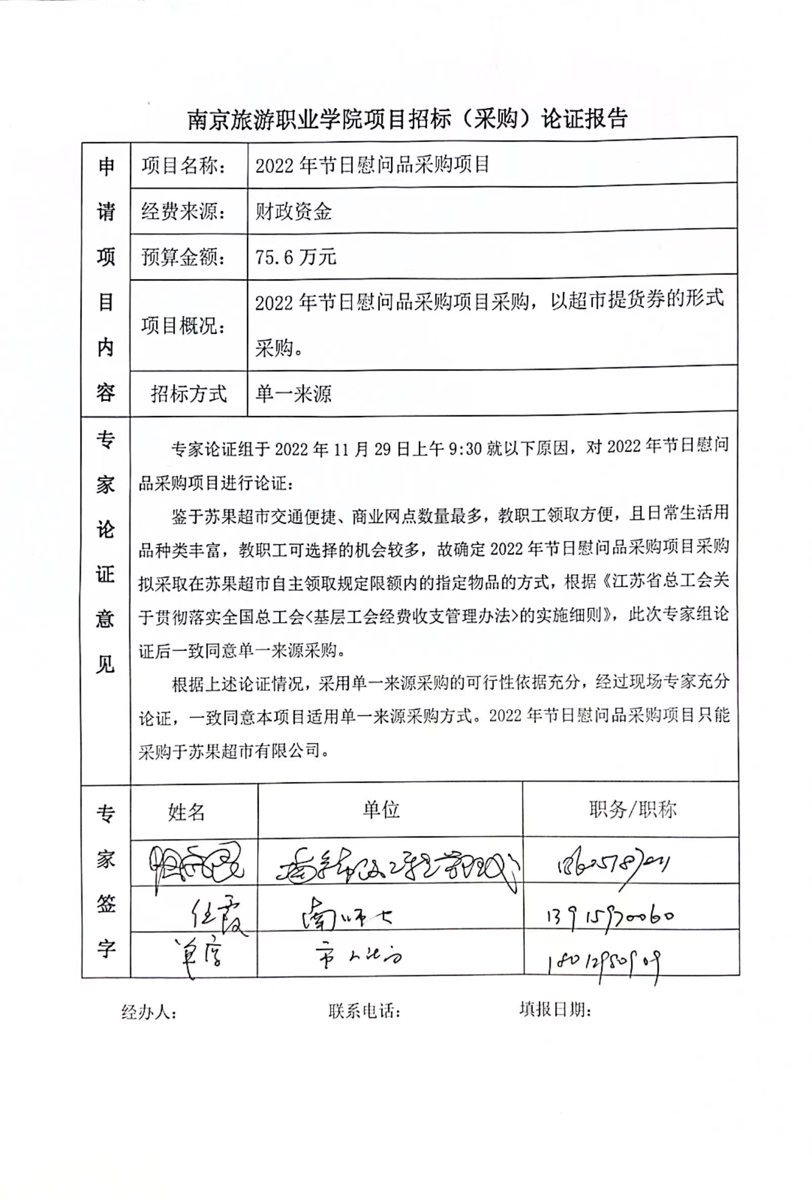 鉴于苏果超市交通便捷、商业网点数量最多,教职工领取方便,且日常生活用品种类丰富,教职工可选择的机会较多,故确定2022年节日福利采购项目采购拟采取在苏果超市自主领取规定限额内的指定物品的方式,根据《江苏省总工会关于贯彻落实全国总工会<基层工会经费收支管理办法>的实施细则》,此次专家组论证后一致同意单一来源采购。
